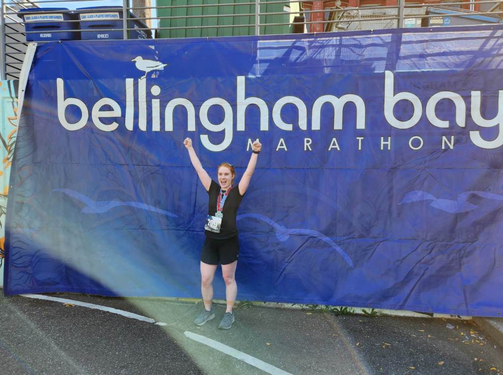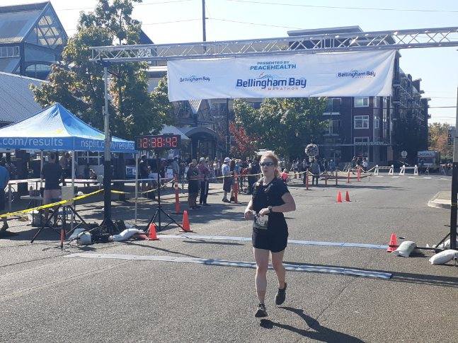 In a blink, I was at the starting line and headed off down the course. By the time the race began, the fog lifted and golden sunlight took its place. My eyes took in scenes of tranquility throughout the race, like the smooth, motionless bay that looked like a sheet of glass, with cranes posing on rocks, silhouetted by the rising run. There were farmlands and fields, complete with a large herd of curious cows. The final section wove us through small, quaint neighborhoods in Bellingham and past another waterfront before ending in a town square.